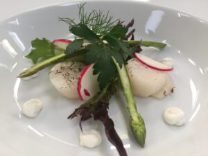 Rimmet hvidfisk med persille-creme og crudité. |