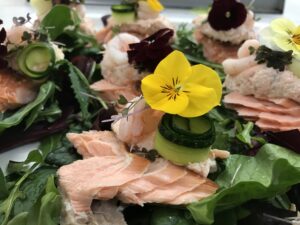 Blinis med laksetatar og krydderurtesalat. |