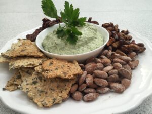 Gl.knas med grønne oliven, bærkompot og knækbrød. |
