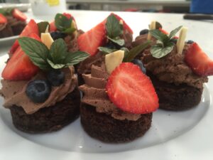 Chokoladebrownie med mousse og hvid chokolade. |